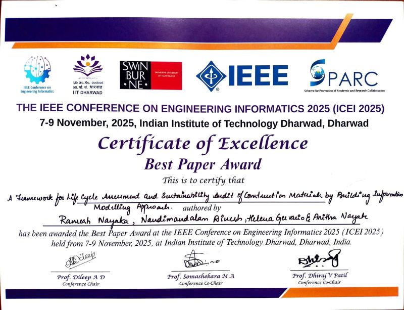 We are delighted to share that our research paper titled “A Framework for Life Cycle Assessment and Sustainability Audit of construction materials by Building Information Modeling approach”, authored by Dr. Ramesh Nayaka, Nandimandalam Dinesh, Helena Gervasioásio, and Anitha Nayak, has been honored with the Best Paper Award at the IEEE Conference on Engineering Informatics (ICEI 2025) was held from 7–9 November 2025 at the Indian Institute of Technology Dharwad.