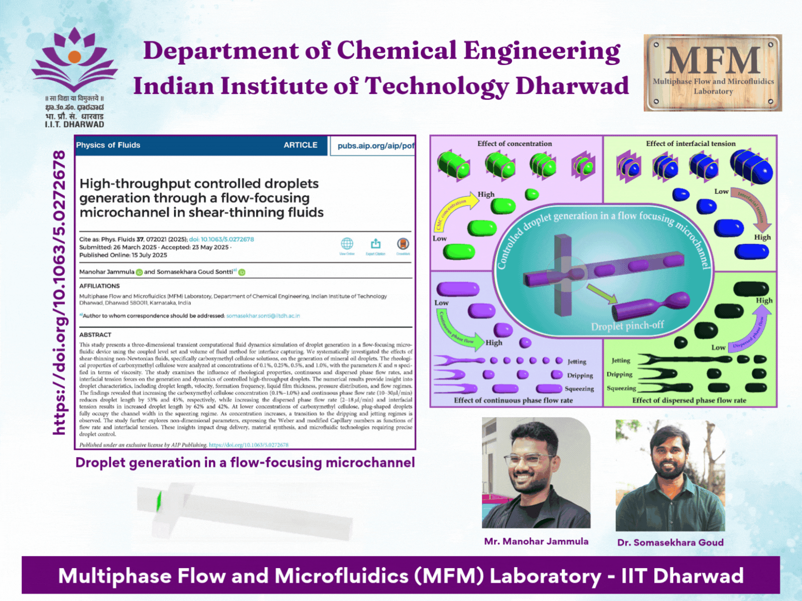 Congratulations to Mr. Manohar Jammula and Dr. Somasekhara Goud Sontti from the Multiphase Flow and Microfluidics (MFM) Group, Department of Chemical Engineering, on their recent publication titled “High-throughput controlled droplet generation through a flow-focusing microchannel in shear-thinning fluids,” published in Physics of Fluids [Q1, IF: 4.1].