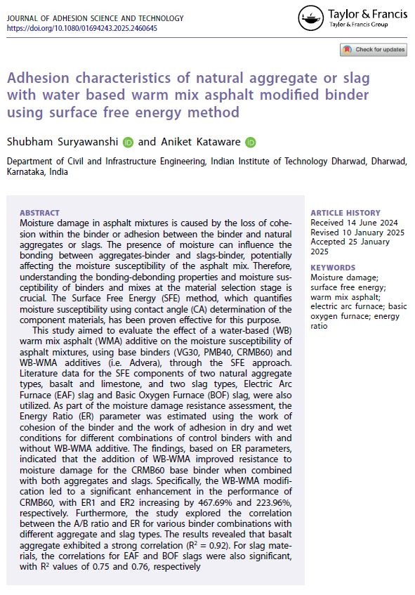 Congratulations to Mr. Shubham Suryawanshi (Ph.D. Scholar) and Prof. Aniket Vasantrao Kataware (Assistant Professor) on their latest publication in the Journal of Adhesion Science and Technology! Their study, titled "Adhesion characteristics of natural aggregate or slag with water-based warm mix asphalt modified binder using surface free energy method," offers valuable insights into the moisture susceptibility of asphalt mixtures.