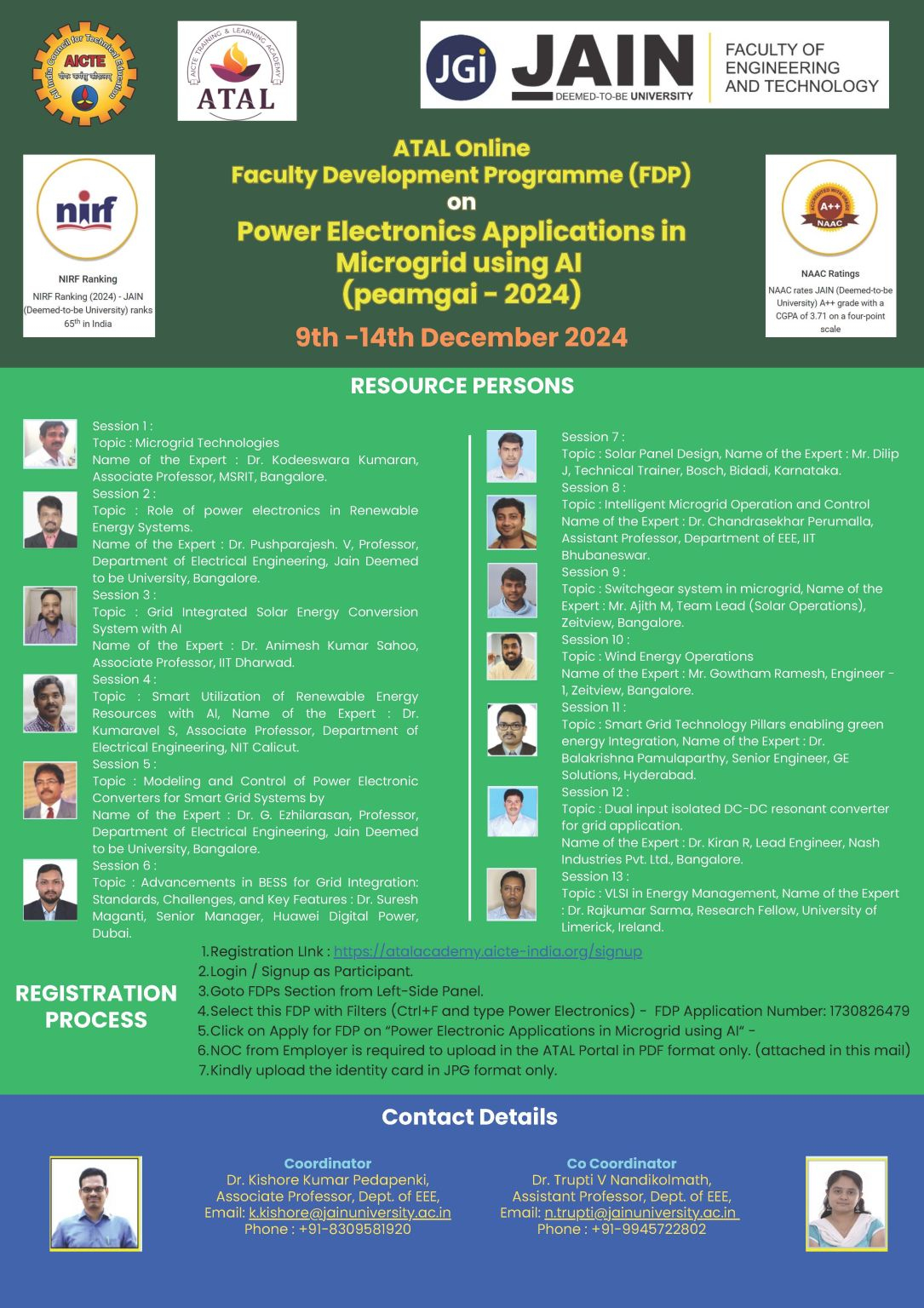 Dr. Animesh Sahoo, Ph.D., Assistant Professor from Power and Energy Group at IIT Dharwad, was recently invited as a resource person in the AICTE sponsored 6 Days ATAL Online Faculty Development Program (FDP) held at the Department of Electrical and Electronics Engineering, Faculty of Engineering & Technology, Jain (deemed to be University), from 9th December to 14th December, 2024. He delivered a talk on 'Grid Integrated Solar Energy Conversion System with Artificial Intelligence (AI)'. He explained the scope of using AI in various aspects in grid-connected solar PV systems. As an emerging future research scope, he emphasised the use of Digital Twin (DT) technology/framework, which can be derived with different modeling methodologies that integrate energy forecasting, demand side management, control, monitoring, and data visualization. Dr. Sahoo's lecture will benefit faculties who participated in the program and are interested in ongoing teaching and research projects.