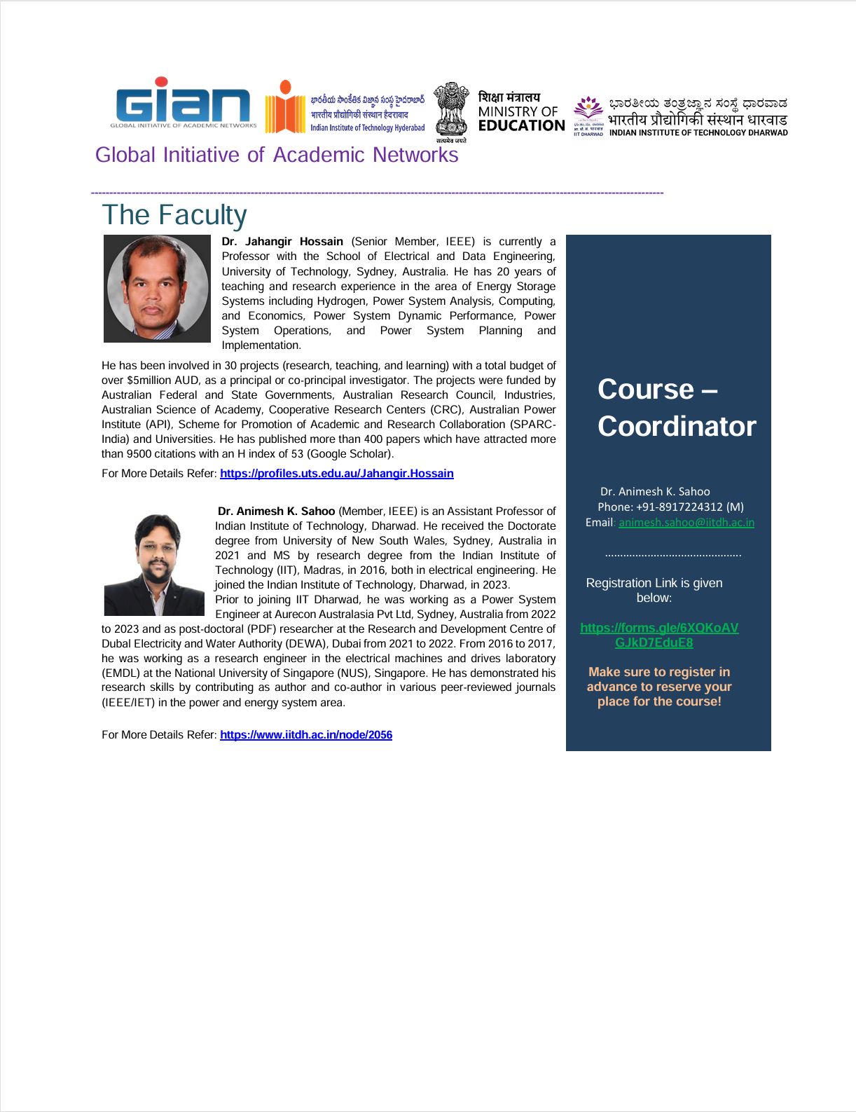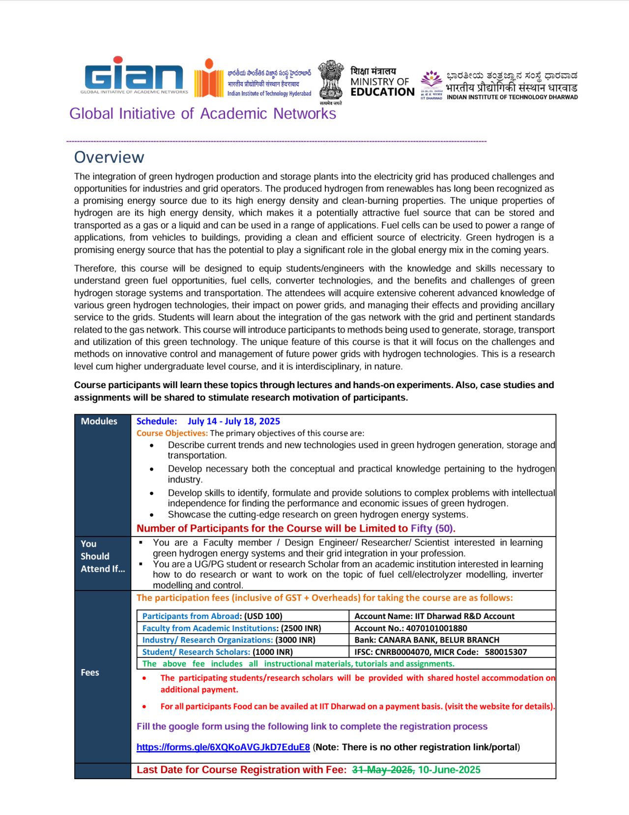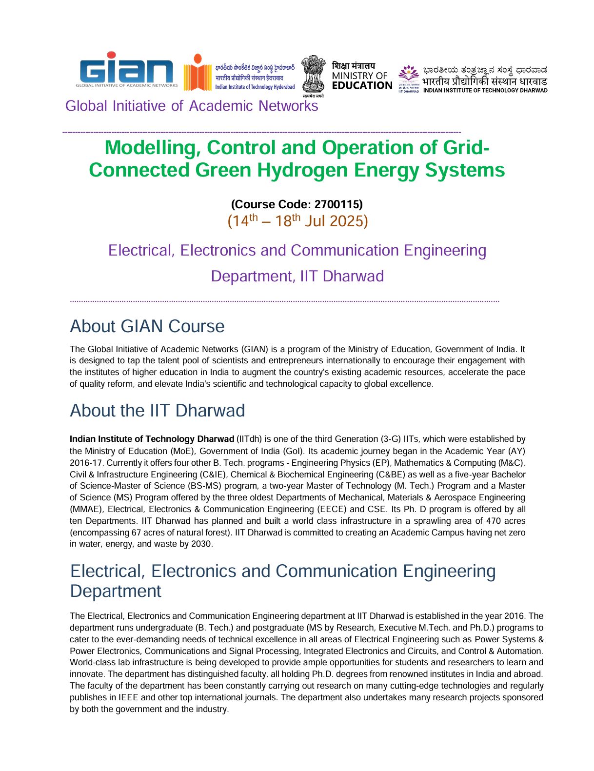 Greetings from the Indian Institute of Technology Dharwad. We are pleased to invite you to register for the GIAN course titled: "Modelling, Control, and Operation of Grid-Connected Green Hydrogen Energy Systems", approved under the Global Initiative of Academic Networks (GIAN) programme, Ministry of Education, Government of India, New Delhi.