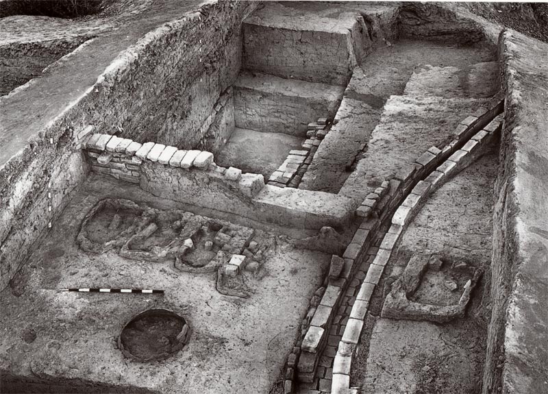In the 1960's and 70's Archaeological Survey of India conducted excavations at the Indus Valley sites of Kalibangan in Rajasthan and Lothal in Gujarat under the Director Generals A. Ghosh, B.B. Lal and B.K. Thapar. Dr. Thapar's document  was uploaded on Penn Museum (Expedition Magazine 17, no.2, January 1970)., where some revealing figures of Indus Valley Civilisation can be found. The fire altars in two Citadel areas at Kalibangan (figure 4 in page 25 and figure 4 in page 27) are shown here.Here are two figures from B. K. Thapar - Expedition 1975 page 25, Citadel area figure 4 and page 27, figure 4. [ Penn Museum: Expedition magazine 17, no.2 (January 1975) B.K.Thapar (1975) Kalibangan: A Harappan Metropolis beyond the Indus Valley] These are from the excavated sites of Kalibangan in Punjab, produced by Archaeological Survey of India.Though the features vary between many such excavated artefects of the Indus Valley Civilization, the essentials of the fire altars are similar.