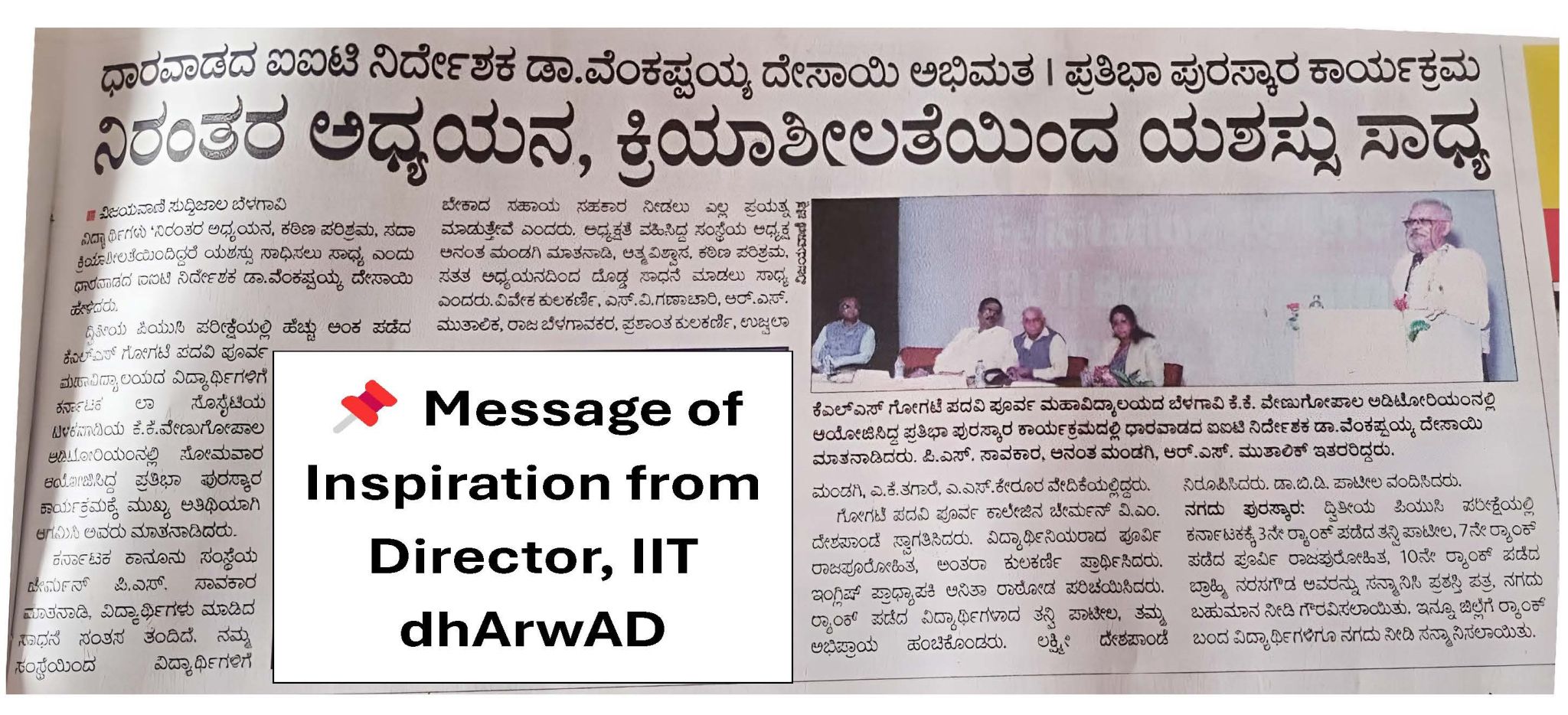 Message of Inspiration from Director, IIT dhArwAD- PROF. VenkappayyA R. dEsAi, Director of IIT dhArwAD, addressed students at the PratibhA PuraskAr event held at K.L.S. Gogte Pre-University College, BeLagAvi, on 19th April 2025.
