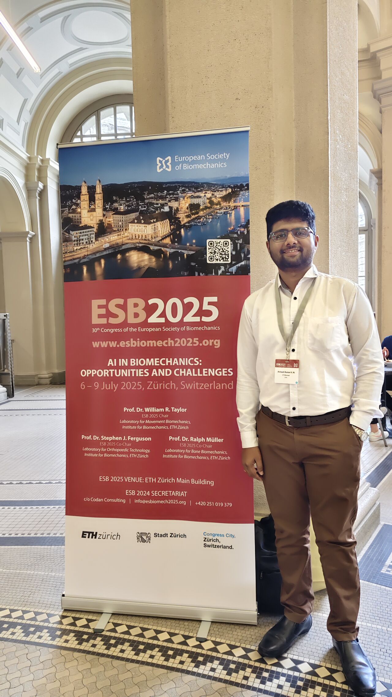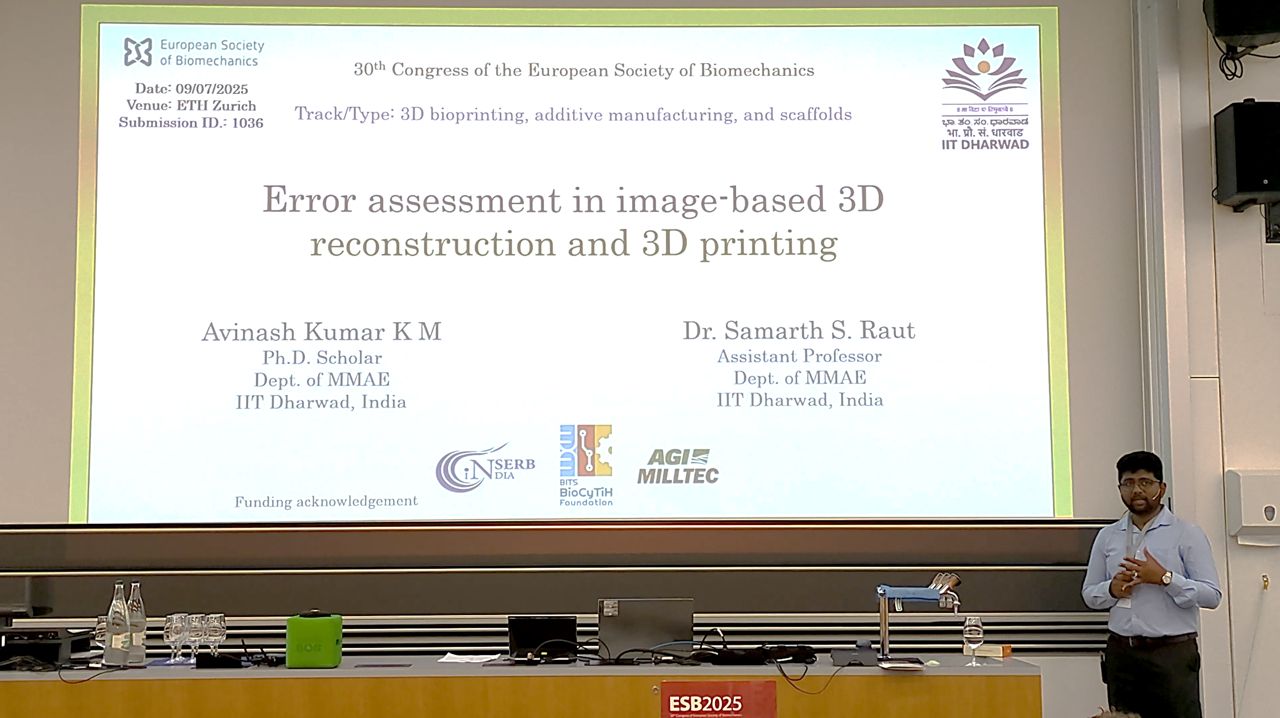 Mr. Avinash Kumar K M, Dept. of Mechanical, Materials and Aerospace Engineering, presented a paper titled "Error Assessment in Image-Based 3D Reconstruction and 3D Printing" at the 30th Congress of the European Society of Biomechanics (ESB2025) held from 6–9 July 2025 at ETH Zurich, Switzerland.