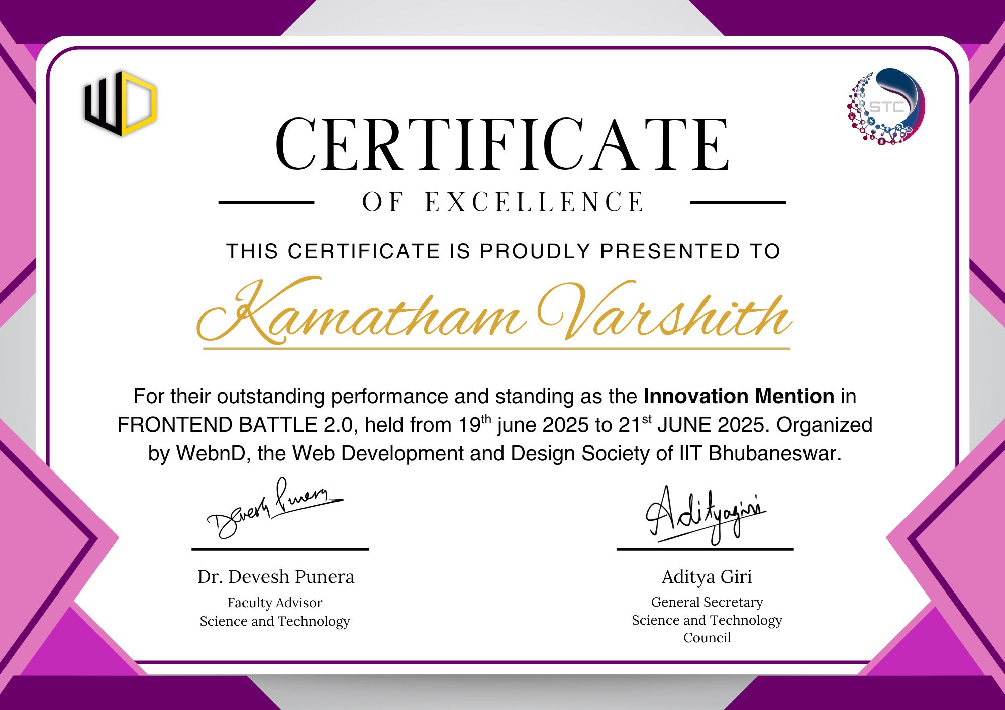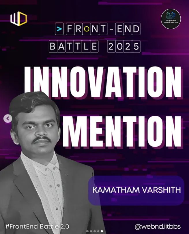 Mr. Kamatham Varshith, BTech student from the Department of Electrical, Electronics and Communication Engineering, IIT Dharwad, earned an Innovation Mention at Frontend Battle '25 — national-level frontend development competition organized by WebnD, the Web Development and Design Society of IIT Bhubaneswar.