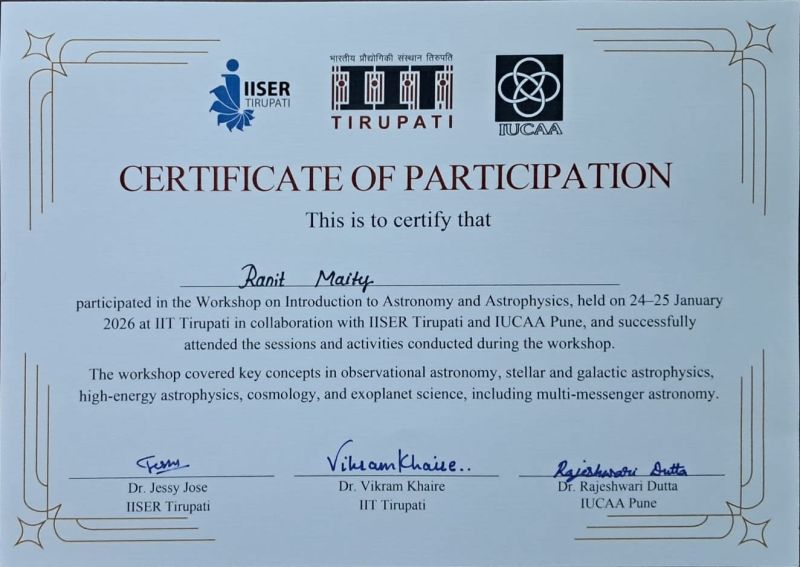 Mr. Ranit Maity, a 2nd-year B.Tech student in Mechanical Engineering, participated in the Workshop on Introduction to Astronomy and Astrophysics held on 24–25 January 2026 at IIT Tirupati, in collaboration with IISER Tirupati and IUCAA Pune.