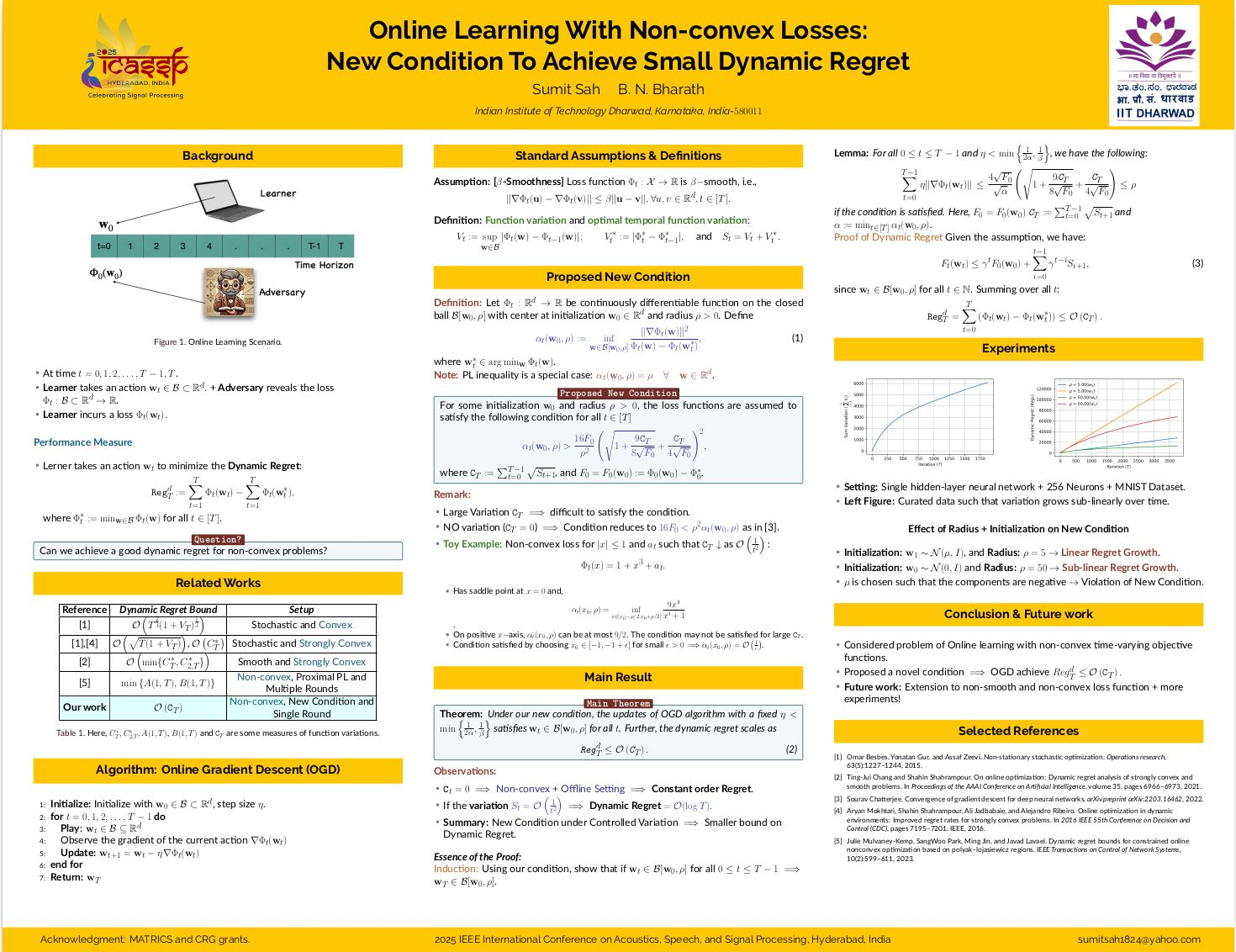 Mr. Sumit Sah, from the Department of Electrical, Electronics, and Communication Engineering has had his paper titled “Online Learning with Non-Convex Losses: A New Condition to Achieve Small Dynamic Regret” accepted for poster presentation at ICASSP (IEEE International Conference on Acoustics, Speech, and Signal Processing). ICASSP is the flagship conference of the IEEE Signal Processing Society and one of the most prestigious global forums in the field of signal processing.