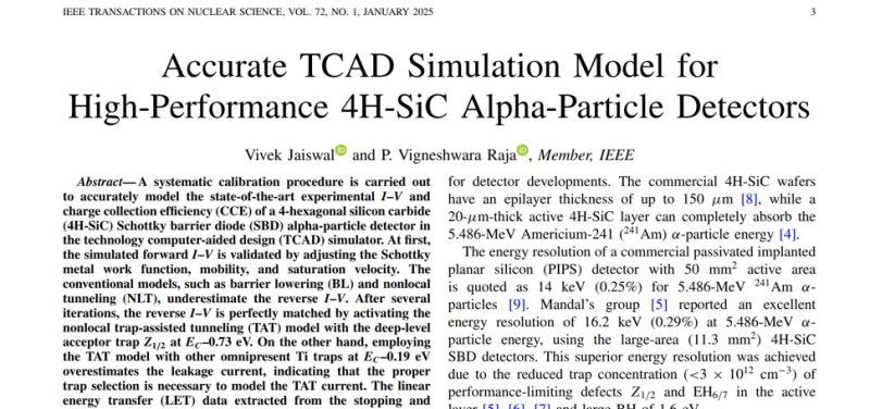 Mr. Vivek Jaiswal developed “Accurate TCAD Simulation Model for High Performance 4H-SiC Alpha-particle Detectors” with the supervision of                     Prof. P. Vigneshwara Raja. This work has been published in IEEE Transactions on Nuclear Sciences (TNS). The detector dark current is modeled using Trap-Assisted Tunneling (TAT). Especially, a novel Heavy-Ion (HI) TCAD model is proposed to validate the charge collection efficiency (CCE) in the entire voltage range, which includes both drift and diffusion-induced transient currents contributing to the CCE. The developed TCAD model can predict the detector characteristics under different operating conditions, which benefits the SiC nuclear detector society.
