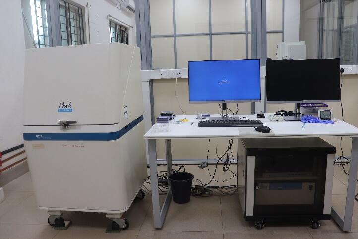 AFM is primarily used to get the 3D images and thickness profiles of nanostructures. This equipment has all the standard imaging modes (contact, true non-contact, tapping, phase imaging). The facility is also equipped with accessories that can be used to study the thermal, electrical, chemical, dielectric etc. properties of material. This equipment can be used to characterize thin film as well liquid samples.