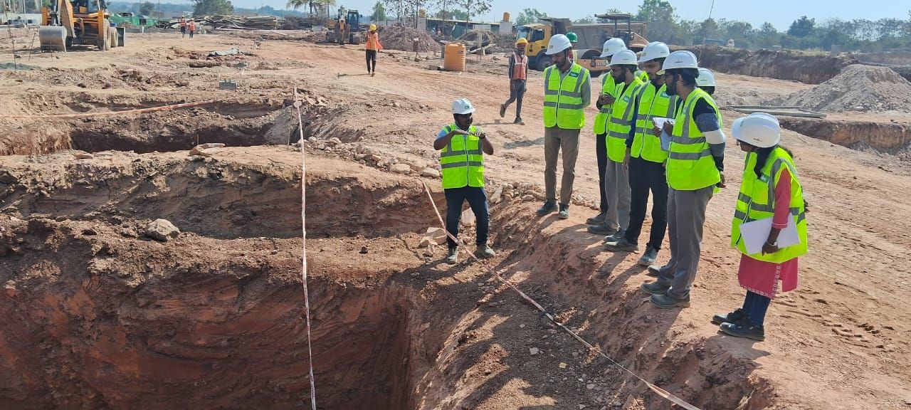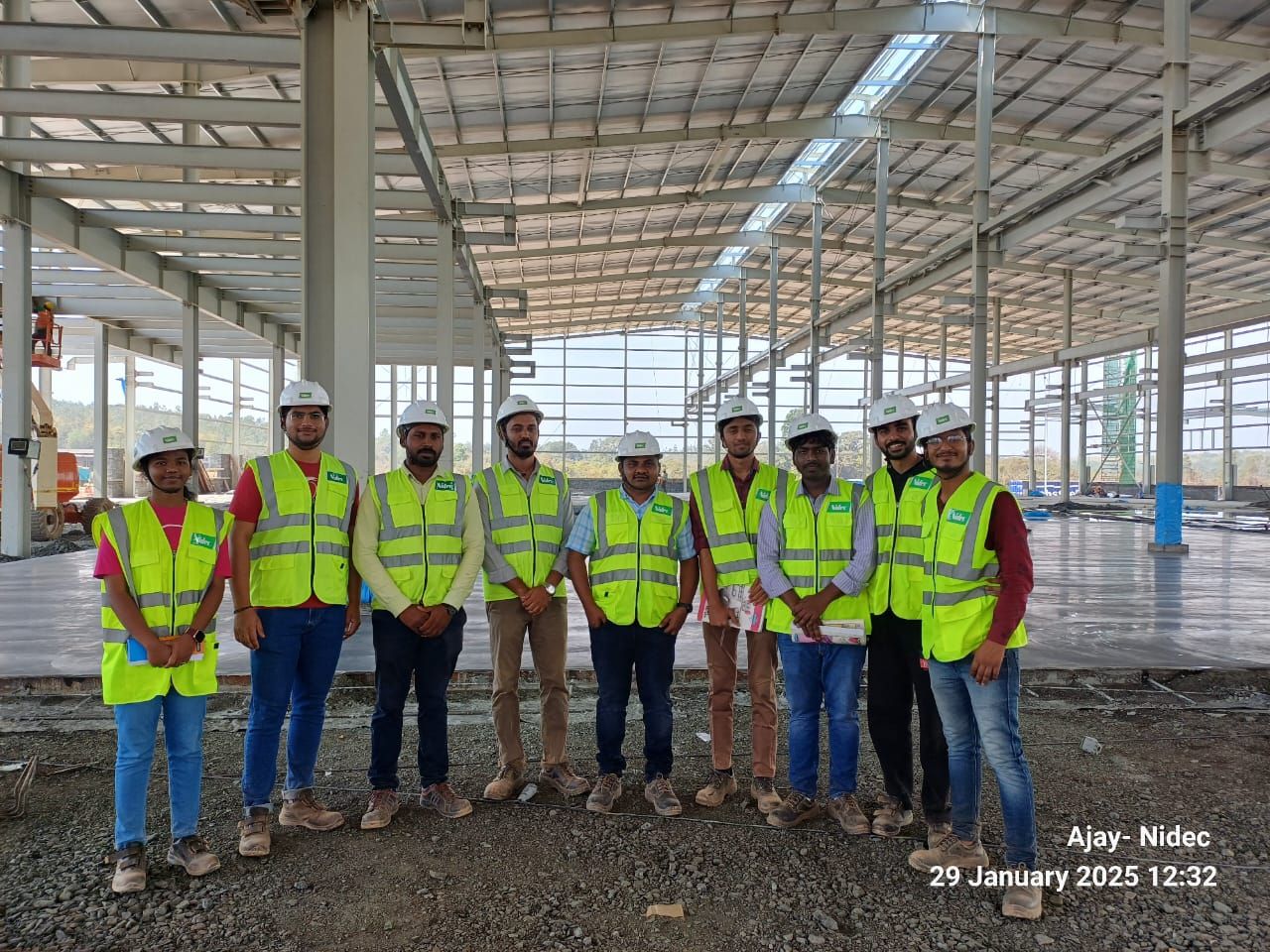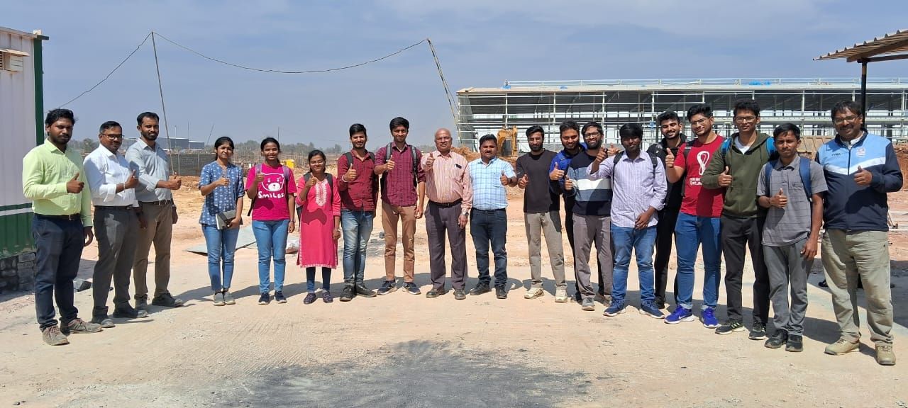 As part of Design of Steel Structures course, handling by Dr. Ramesh Nayaka, 3rd-year B. Tech Civil and Infrastructure Engineering students visited the construction site of PEB steel structure on Wednesday, 29th January 2025. The site visit to the ongoing project at KIADB, Belur Industrial Area provided the students with valuable practical exposure to real-world construction practices. Under the guidance of Dr. Ramesh Nayaka and NIDEC team, this visit helped students gain a deeper understanding of various steel sections, structural connections, and execution techniques used in PEB steel structure. Observing the fabrication, erection, and assembly of steel components firsthand allowed them to bridge the gap between theoretical concepts and on-site implementation. The interaction with NIDEC team further enriched their knowledge, giving them insights into industry standards, safety protocols, and best practices followed in steel structure construction.