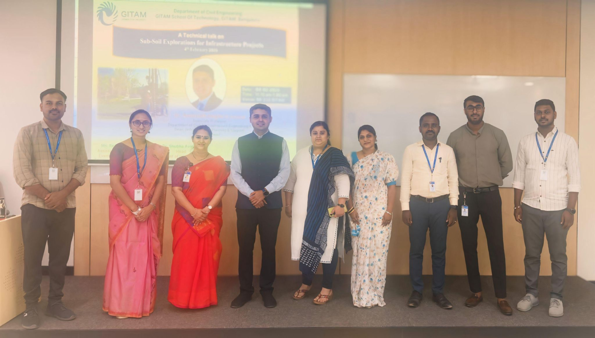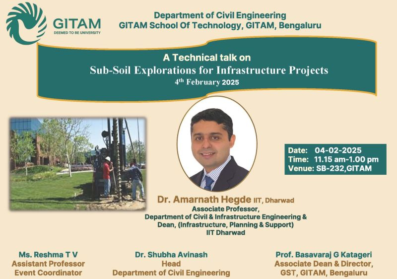 Prof. Amarnath Hegde delivered an invited talk on the topic of “Sub-Soil Exploration for Infrastructure Projects” at the Department of Civil Engineering, GITAM School of Technology Bengaluru, on 4th February 2025. During the visit, Dr. Hegde interacted with faculties & students of the department and visited various laboratory facilities.