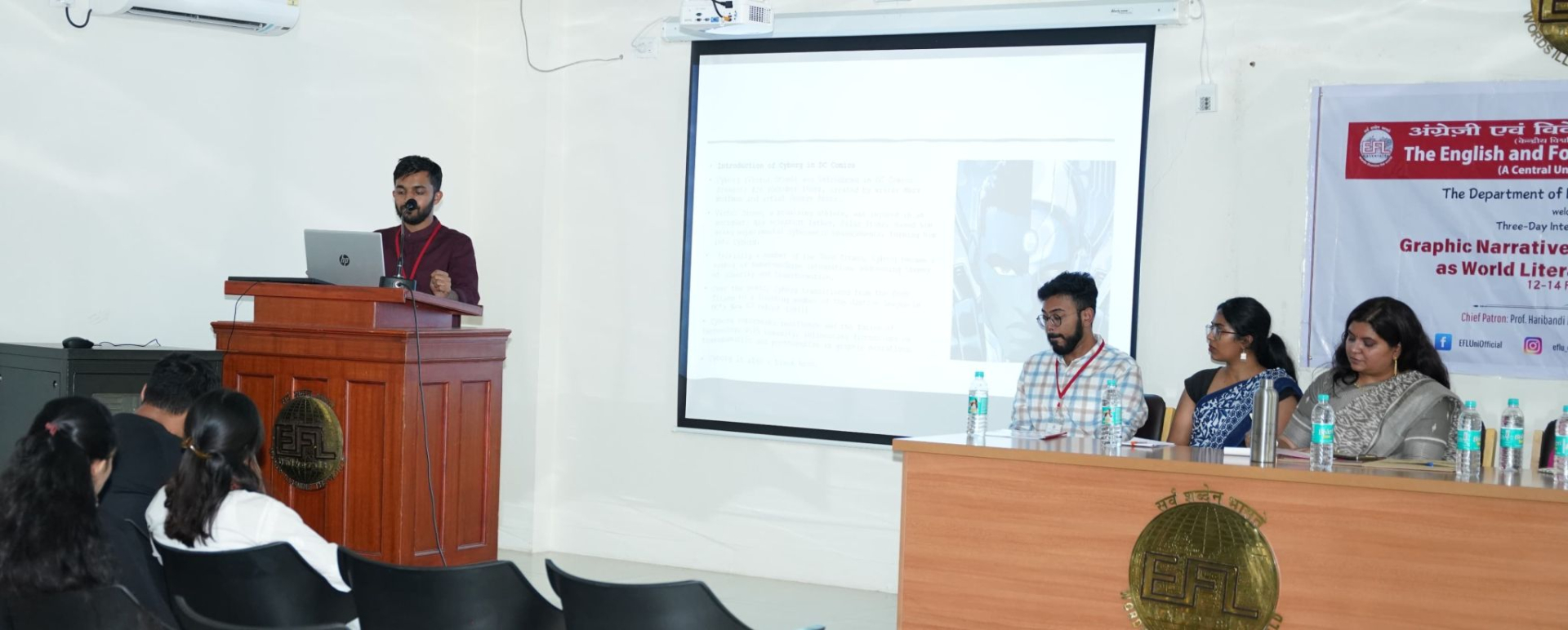 Prof. Ridhima Tewari and her Ph.D Scholar presented their work on Posthumanism at the International Conference on "Graphic Narratives and Comics Studies as World Literature Phenomena," held at The English and Foreign Languages University, Hyderabad. Their paper titled "The Human-Machine Hybrid: Exploring Cyborg through Transhumanist and Posthumanist Lenses" was well-received at the prestigious conference that had many eminent speakers and panelists from the field of Graphic Narratives and Comics Studies.