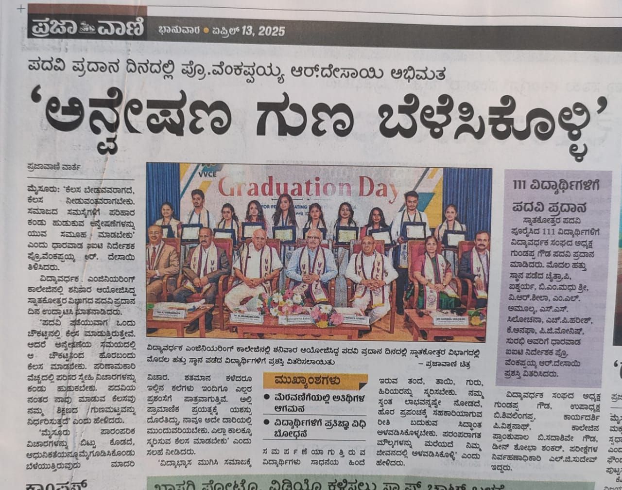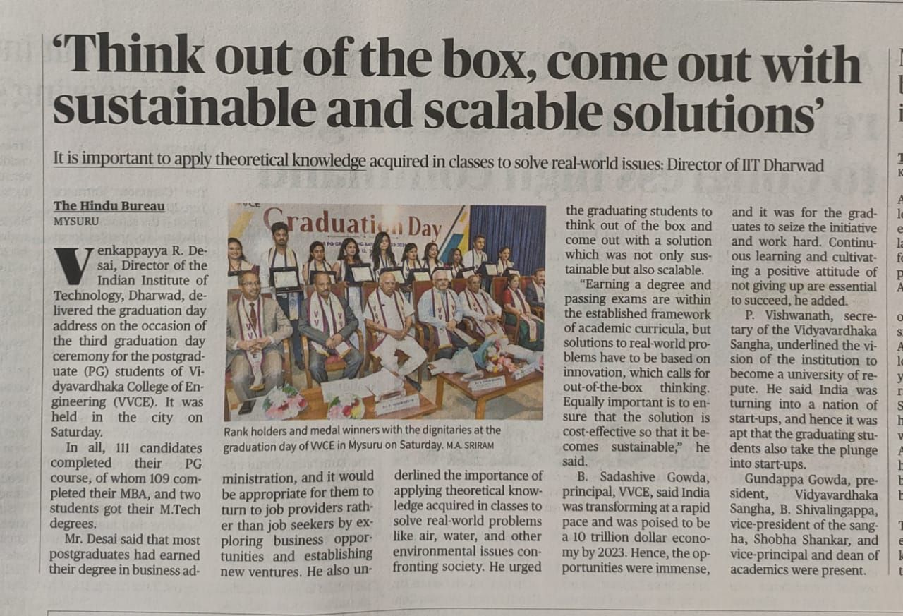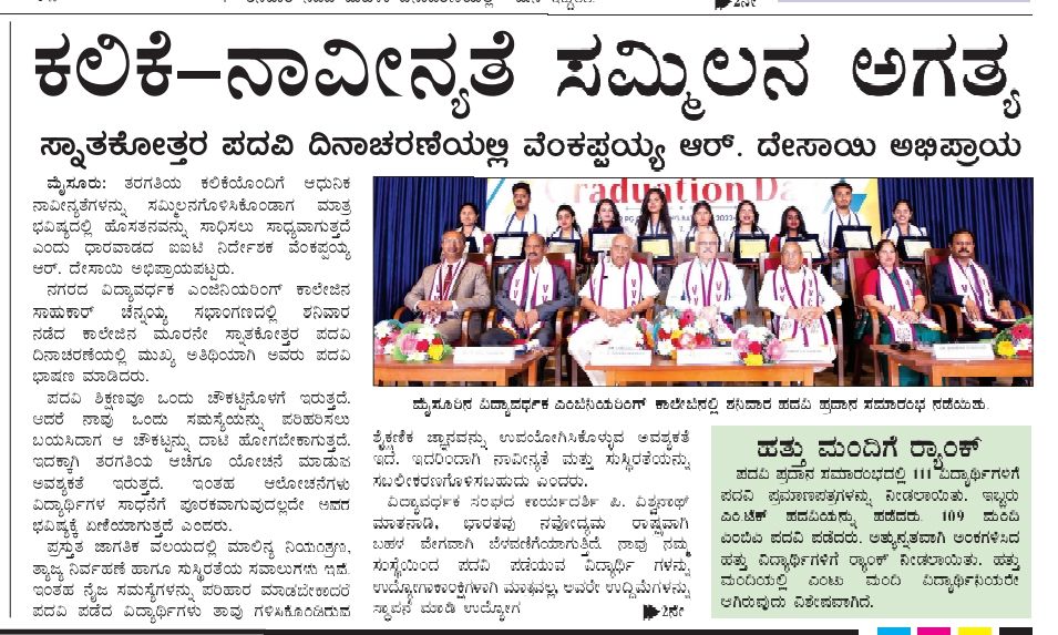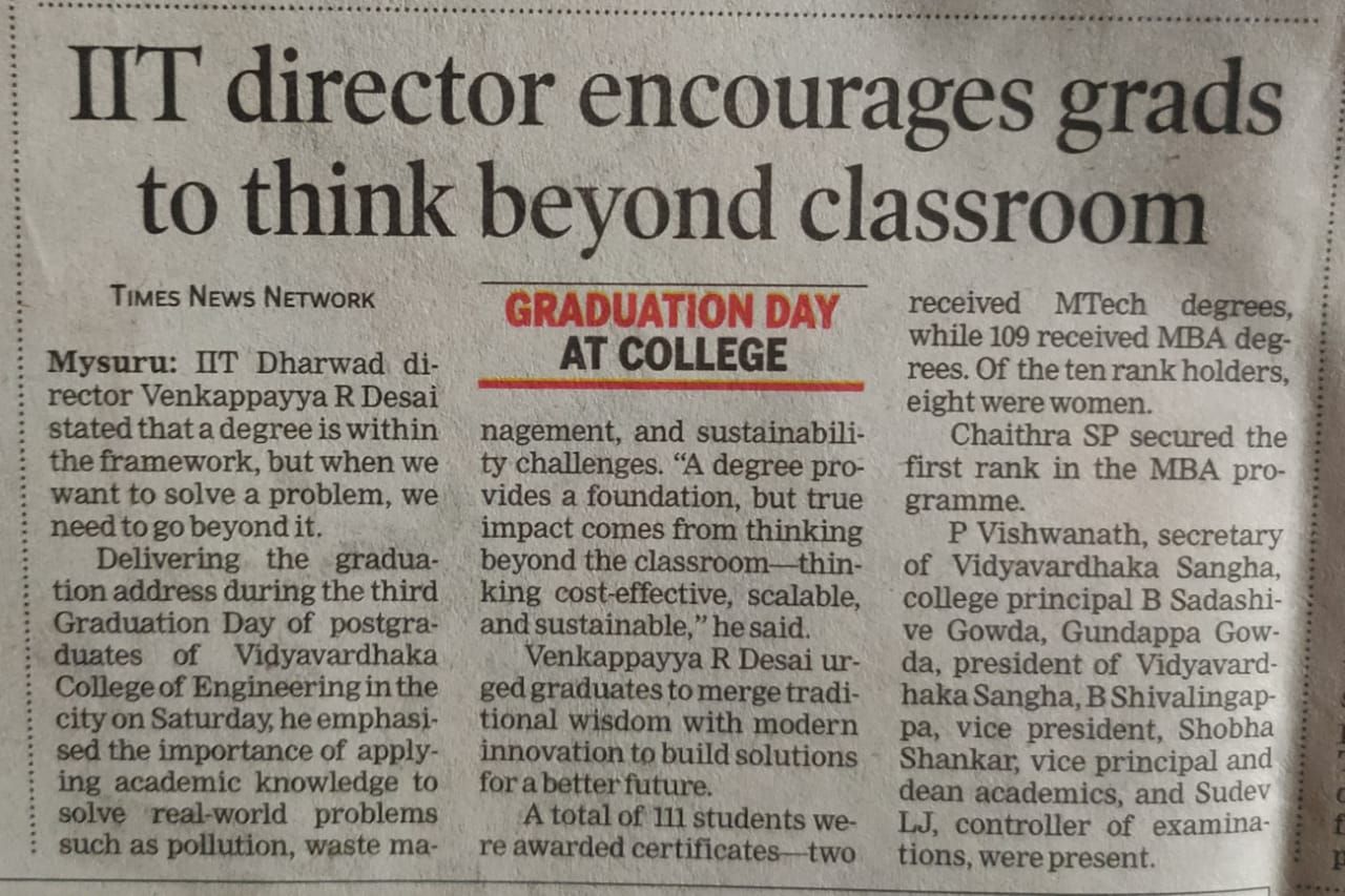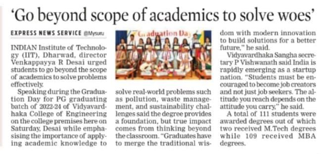 Prof. VenkappayyA R. dEsAi, Director, IIT dhArwAD, addressed the graduation day ceremony of PG students at Vidyavardhaka College of Engineering (VVCE), Mysuru.