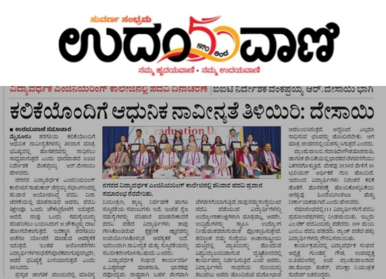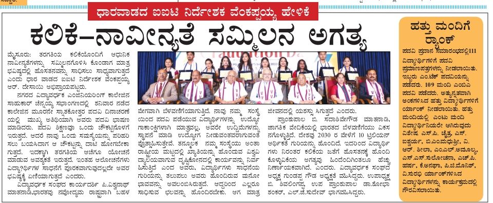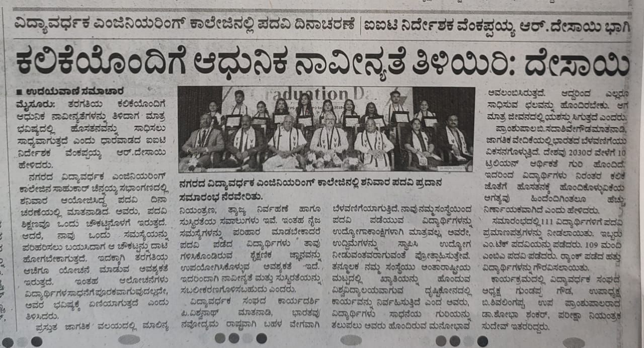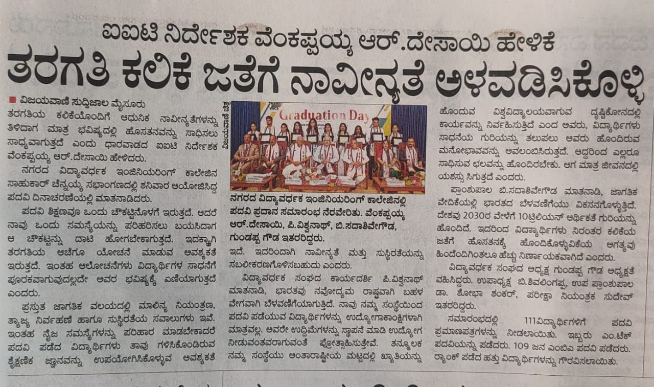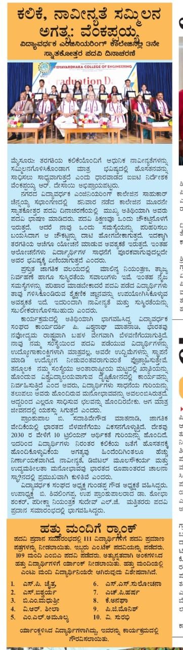 Prof. VenkappayyA R. dEsAi, Director, IIT dhArwAD, addressed the graduation day ceremony of PG students at Vidyavardhaka College of Engineering (VVCE), Mysuru.