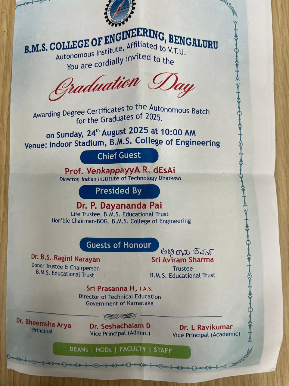 Prof. VenkappayyA R. dEsAi, Director, IIT dhArwAD, was invited as the Chief Guest for the Graduation Day Ceremony of the 2025 batch at B.M.S. COLLEGE OF ENGINEERING, Bengaluru on 24th August 2025.