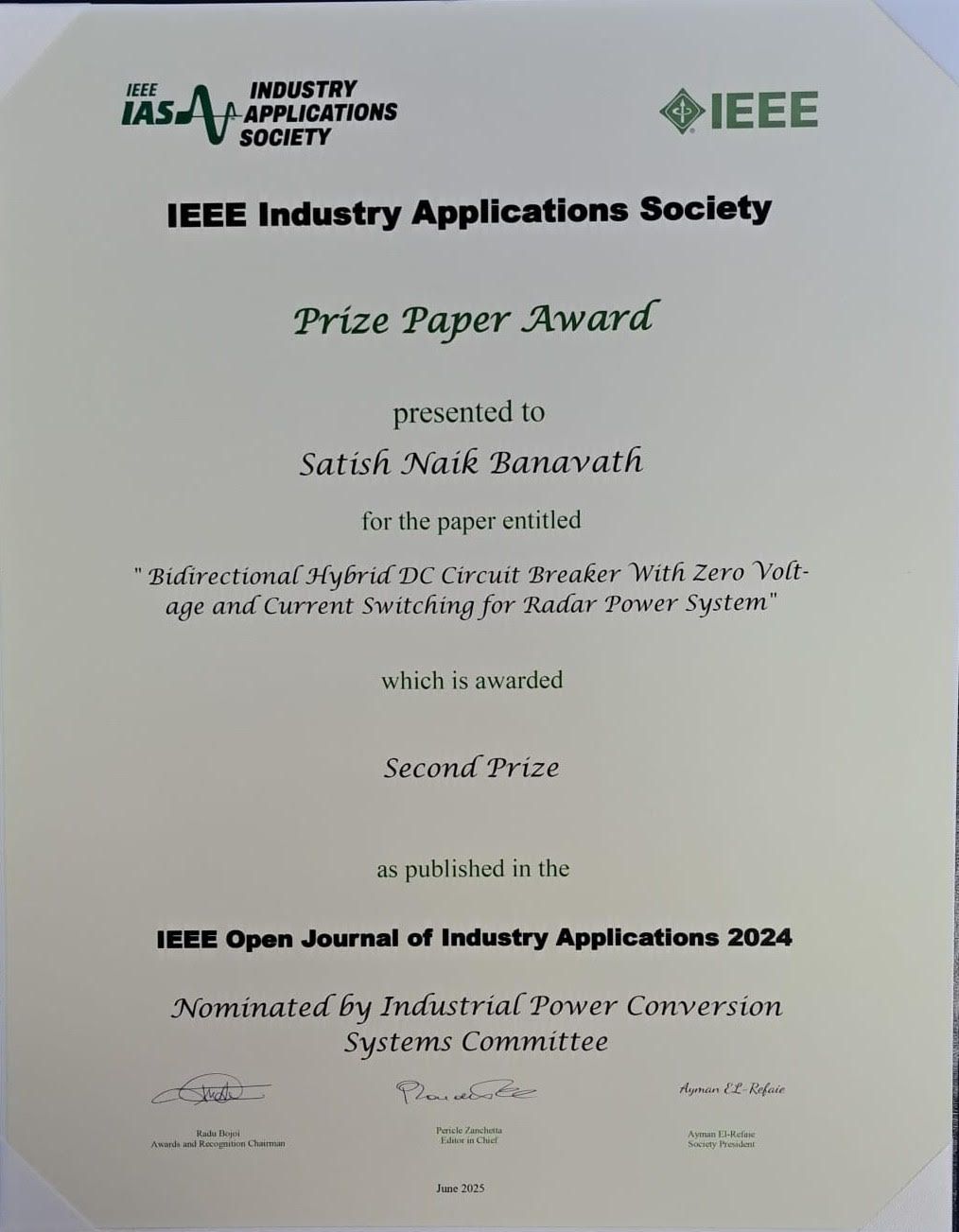 Pleased to share that paper “Bidirectional Hybrid DC Circuit Breaker With Zero Voltage and Current Switching for Radar Power System” has been awarded Second Place in the Best Paper Awards 2024 by the IEEE Open Journal of Industry Applications.