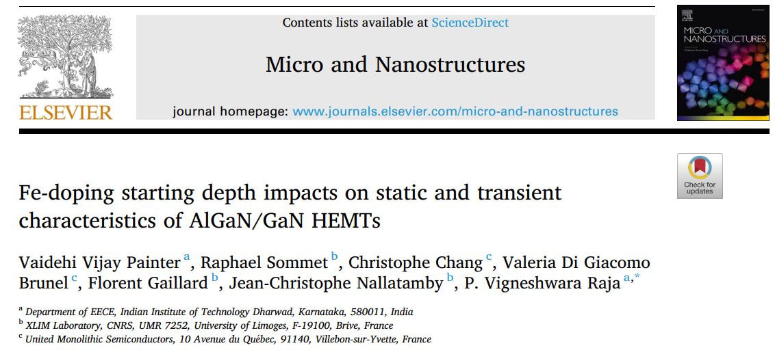 We are happy to share our first joint collaborative journal publication between IIT Dharwad, XLIM Laboratory France, and UMS - United Monolithic Semiconductors, entitled “Fe-doping starting depth impacts on static and transient characteristics of AlGaN/GaN HEMTs”. This work is carried out by Ms. Vaidehi Painter with the supervision of Prof. P. Vigneshwara Raja. The paper can be downloaded from the shared link: https://lnkd.in/dSQt9B2s
