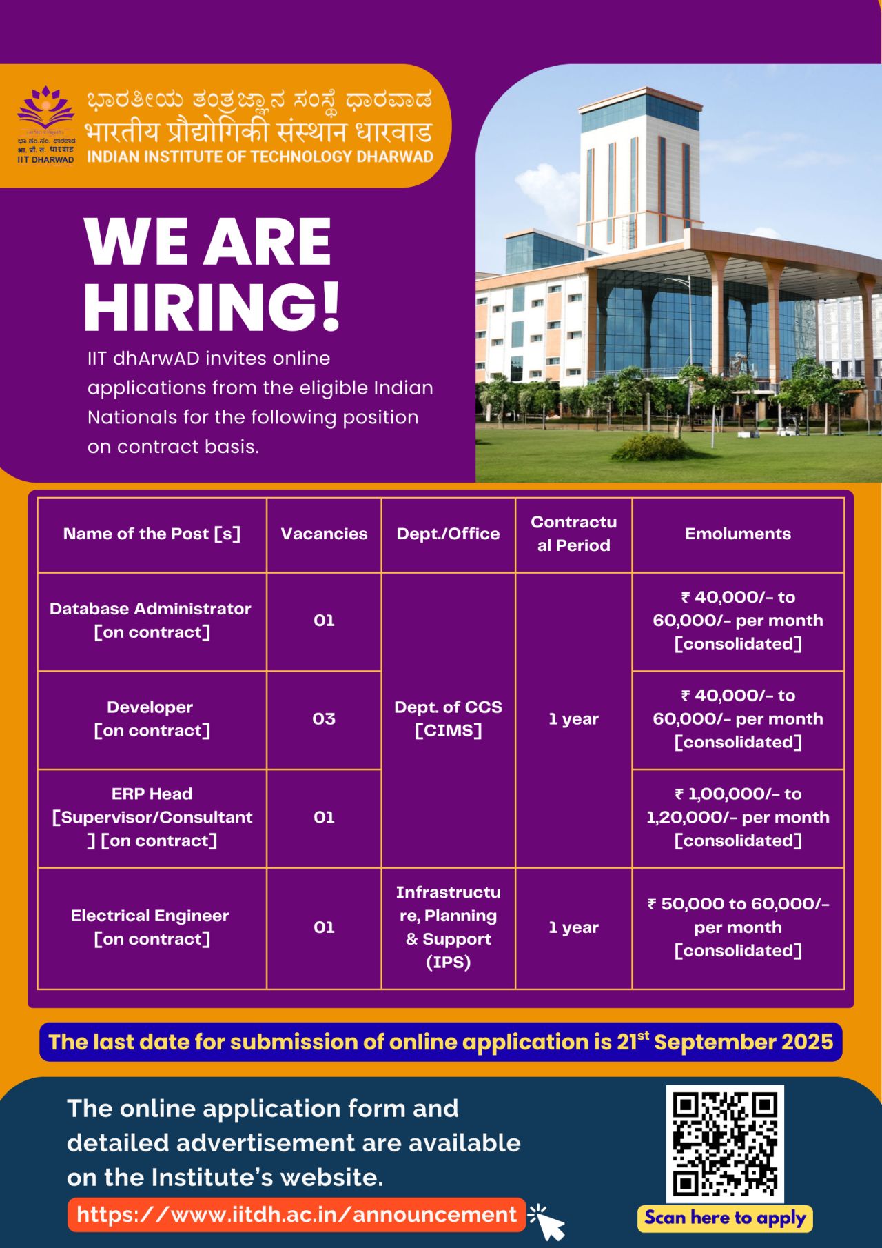 IIT dhArwAD invites online applications from eligible Indian Nationals for the following positions on contract basis: