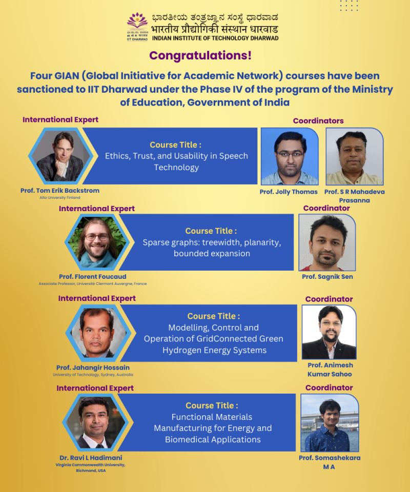 We are pleased to announce that four GIAN (Global Initiative for Academic Network) courses have been sanctioned to IIT Dharwad under Phase IV of the Ministry of Education, Government of India. These courses, led by distinguished international experts, will enrich our academic landscape with cutting-edge knowledge and global perspectives.